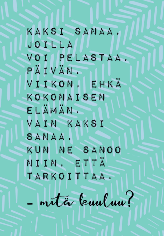 Lue lopuksi ääneen, mitä olet kirjoittanut ja tunnustele, mitä ajatuksia tai tunteita se sinussa herättää. Muista, että kaikki tunteet ovat sallittuja. Sinä et ole yhtä kuin tunteesi.