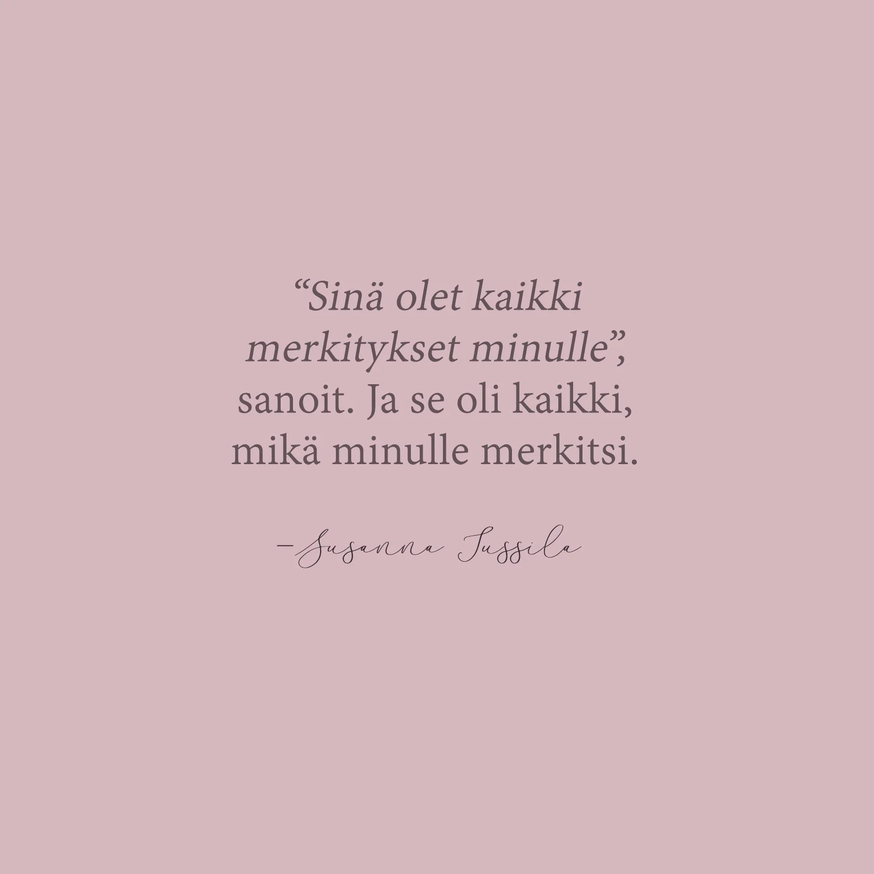 Kaikki mikä merkitsi Merkittäviin hetkiin 2. jouluk. Kirjoittaja: Susanna Jussila Kaikki mikä merkitsi“Sinä olet kaikkimerkitykset minulle”,sanoit. Ja se oli kaikki,mikä minulle merkitsi. Susanna Jussila