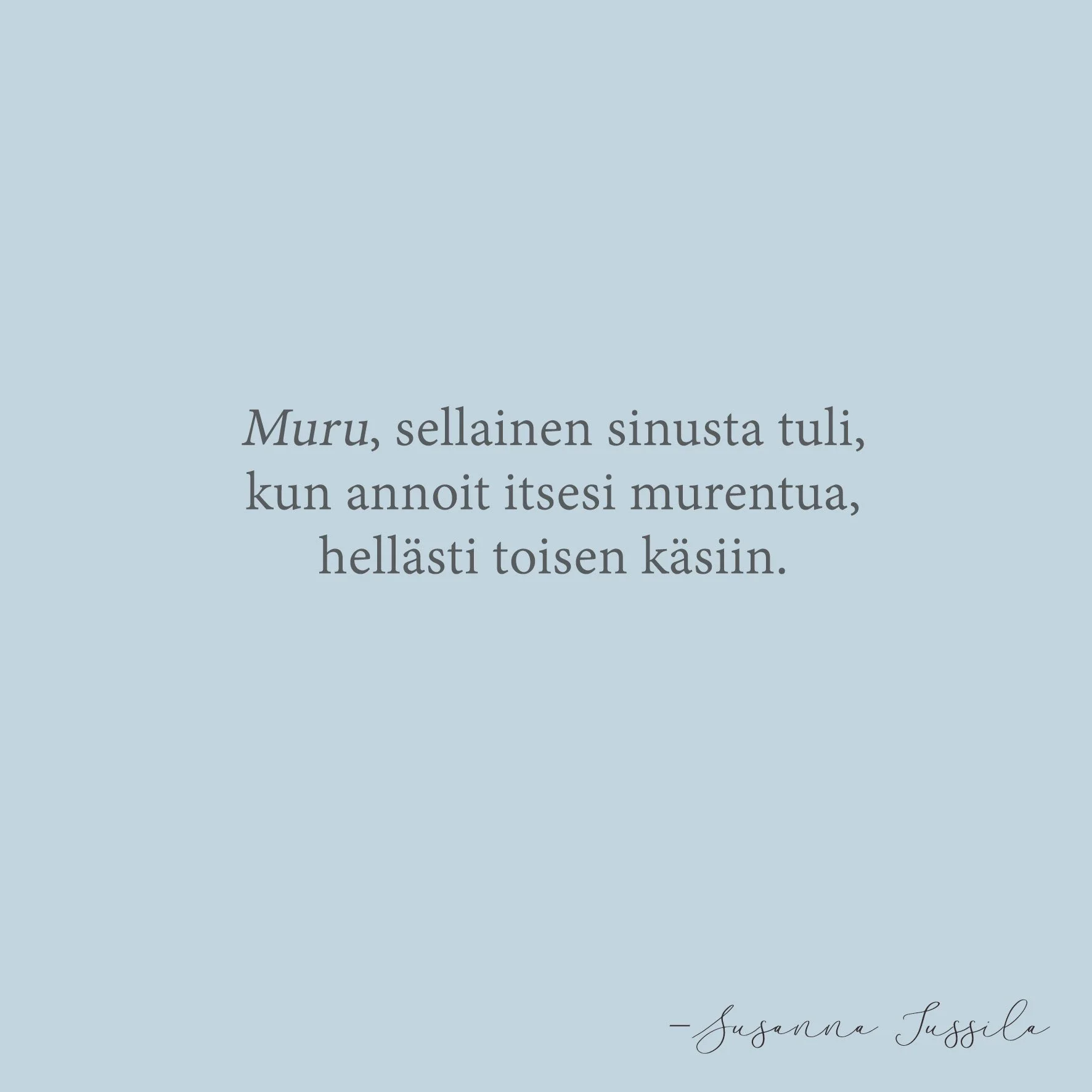 Muru Merkittäviin hetkiin 1. jouluk. Kirjoittaja: Susanna Jussila Muru,sellainen sinusta tuli,kun annoit itsesi murentuahellästi toisen käsiin. Susanna Jussila
